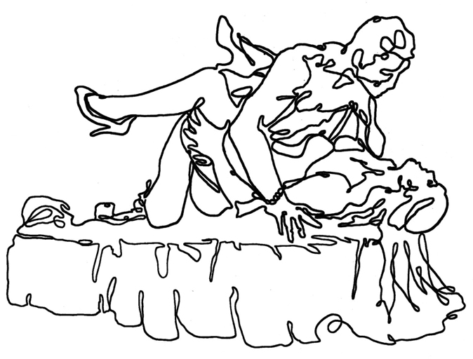Abbominevole e Ozmo fanno invece del puro libertinaggio artistico! Coppia di feticisti del dettaglio morboso, e sacerdoti dell’allucinazione, non si limitano a costruire veri propri cadaveri squisiti innestando fumetti osceni a figure rapinate all’iconografia medievale, barocca o rinascimentale, ma come dei Dottori Frankenstein cuciono assieme le membra rubate nottetempo nel solenne cimitero delle Immagini della Storia dell’Arte per dare vita al loro personalissimo monstrum; al tempo stesso ne descrivono in ogni minuziosa parte l’anatomia, dissezionandone i muscoli e le ossa e disperdendoli nello spazio, sui muri, come rincorrendo idee che sfuggono ad un’ormai irreperibile origine.
