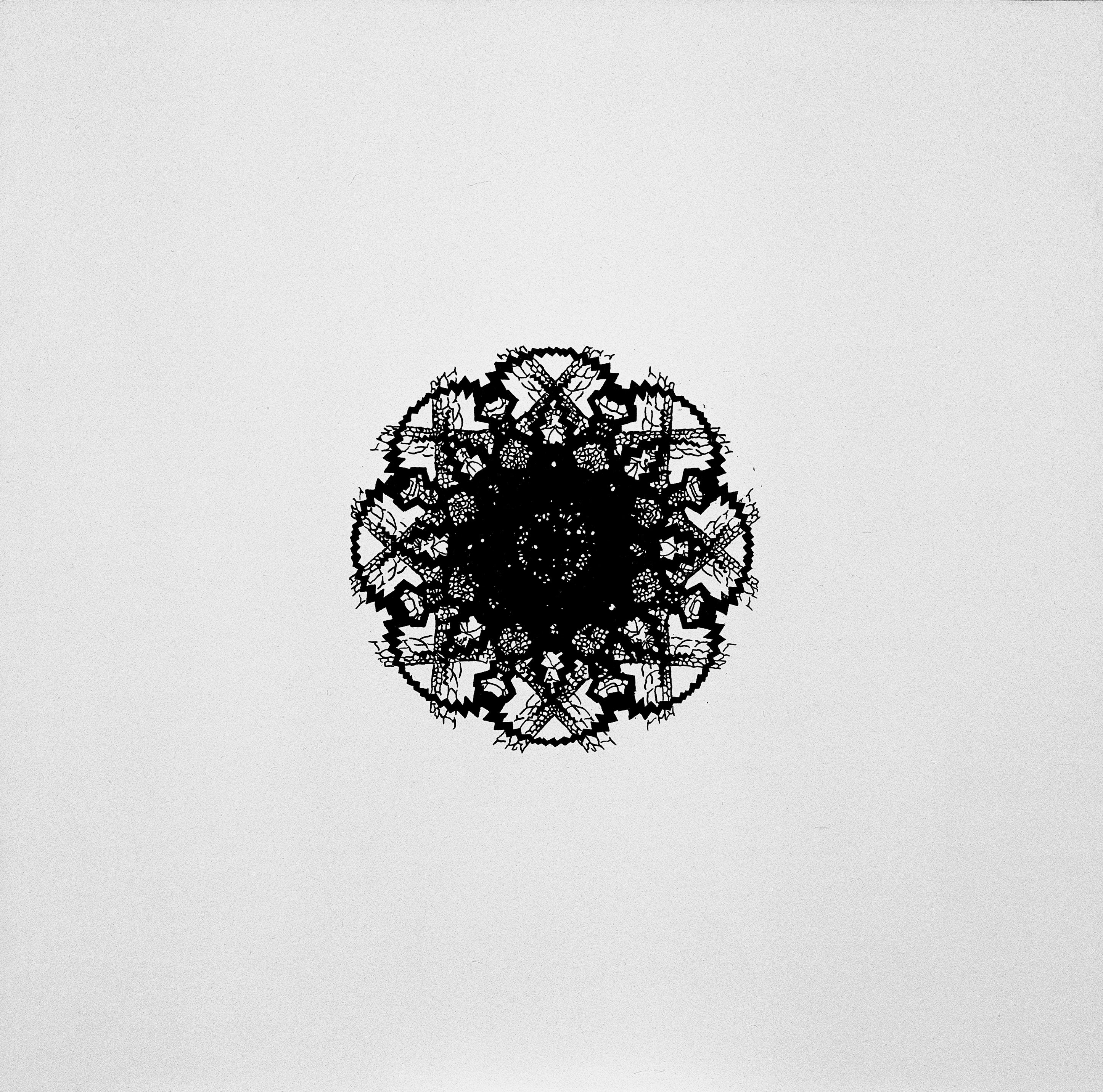 Alessia Chiappino, tra i più giovani artisti qui presenti, attraversa la pratica, il Tempo della scrittura per creare dei patterns che trascendano il significato del testo, sublimandosi in forme geometriche assolute che ricompongono la dispersione ossessiva del tempo impiegato, l’utile inutilità della meditazione, l’angoscia del vuoto, il mantra dello svuotamento di sè, del senso stesso, in una sorta di mandala laico, un edificio di calligrafie privo di ingressi come di uscite!