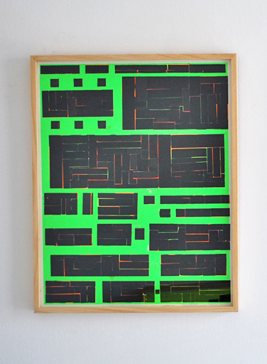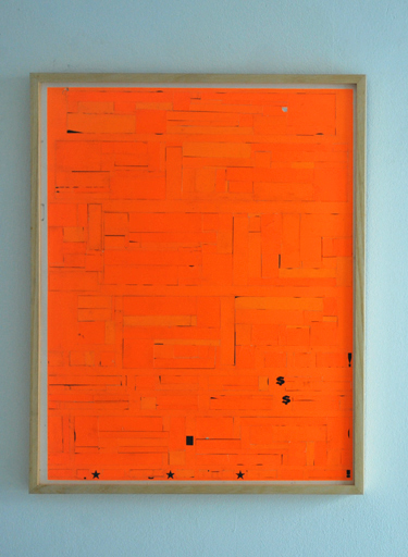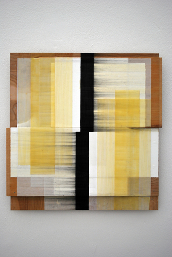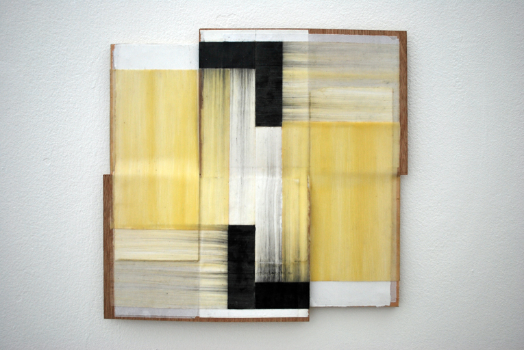 Melissa Kretschmer propone alcuni lavori che si collocano a metà tra pittura scultura utilizzando materiali “poveri” per esaltarne le qualità intrinseche. La luminosità liquida della cera è amplificata nell’alternanza con gli strati di legno del supporto e nel mescolarsi o sovrapporsi ad altri materiali quali la carta o la grafite, che, oltre a spezzare l’ omogenea superficie dominata dal giallo, conferisce una concretezza inedita alle opere.