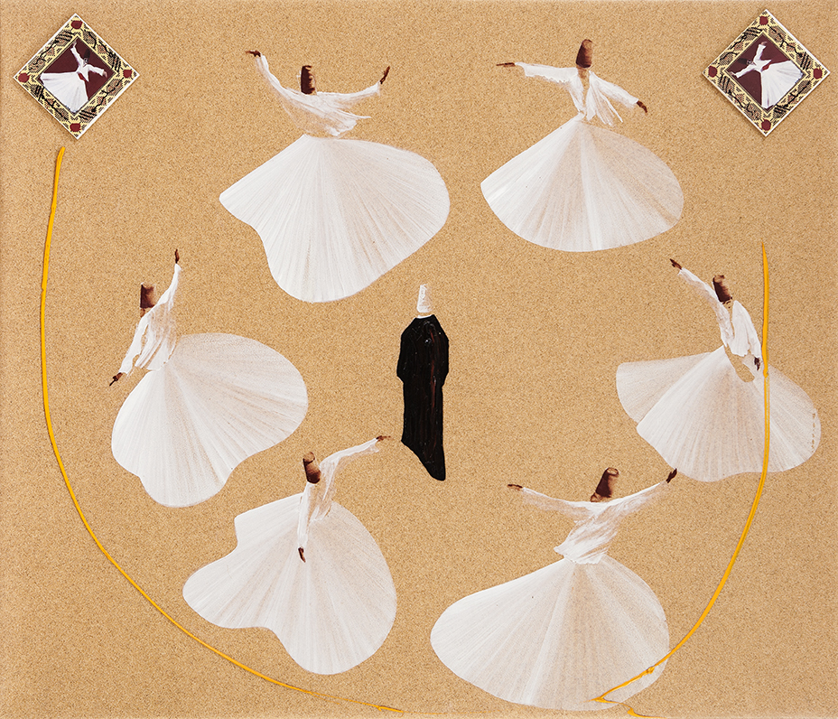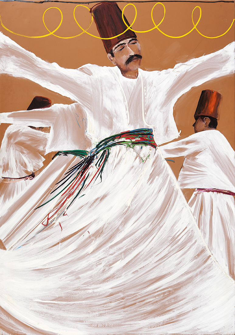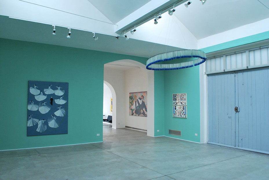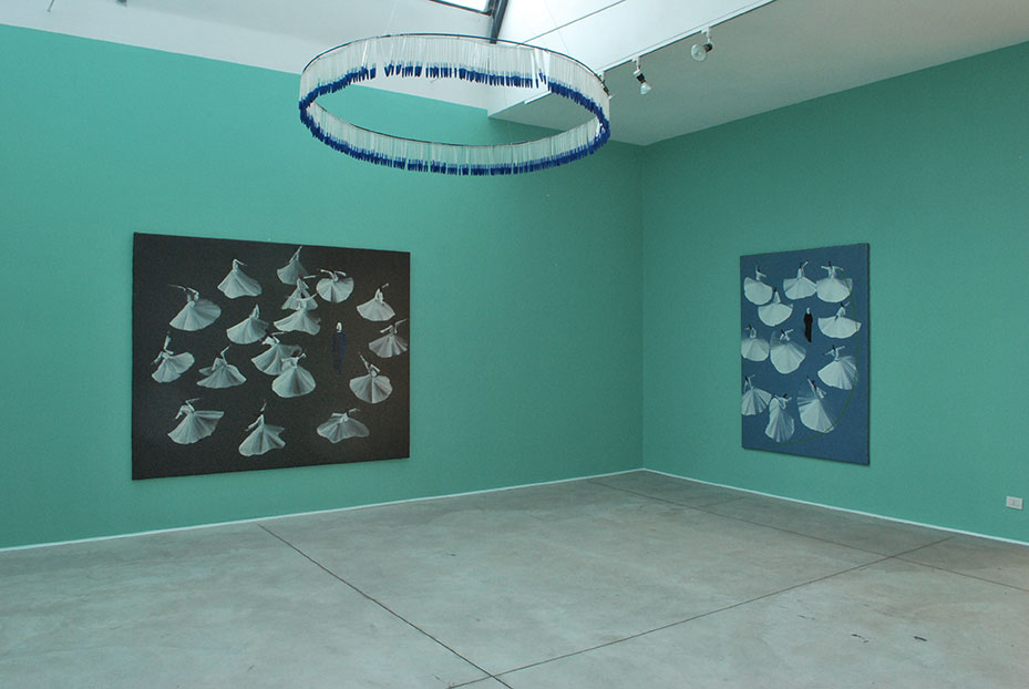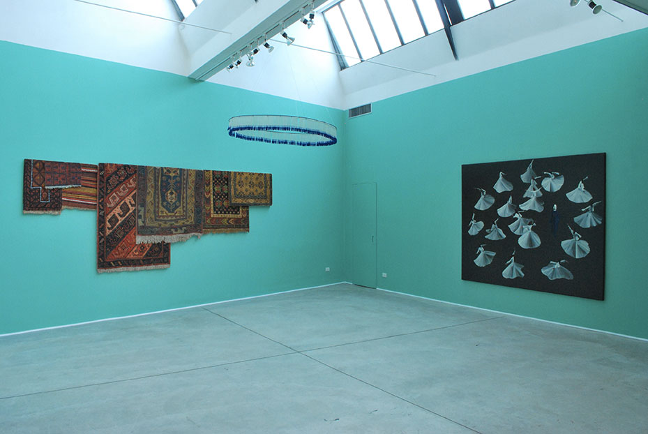 Il percorso ideale parte da Venezia, precisamente dalla Biennale del 1993, dove Mondino è protagonista con una memorabile performance che vede coinvolti un gruppo di dervisci rotanti fatti venire direttamente dalla Turchia. Nella galleria di Giuseppe Pero viene riprodotta, nel modo più fedele possibile, persino nei colori delle pareti, la sala che fu teatro dell’evento, con i Tappeti Stesi, il lampadario con le penne Bic e uno dei grandi quadri con dervisci di quella Biennale.