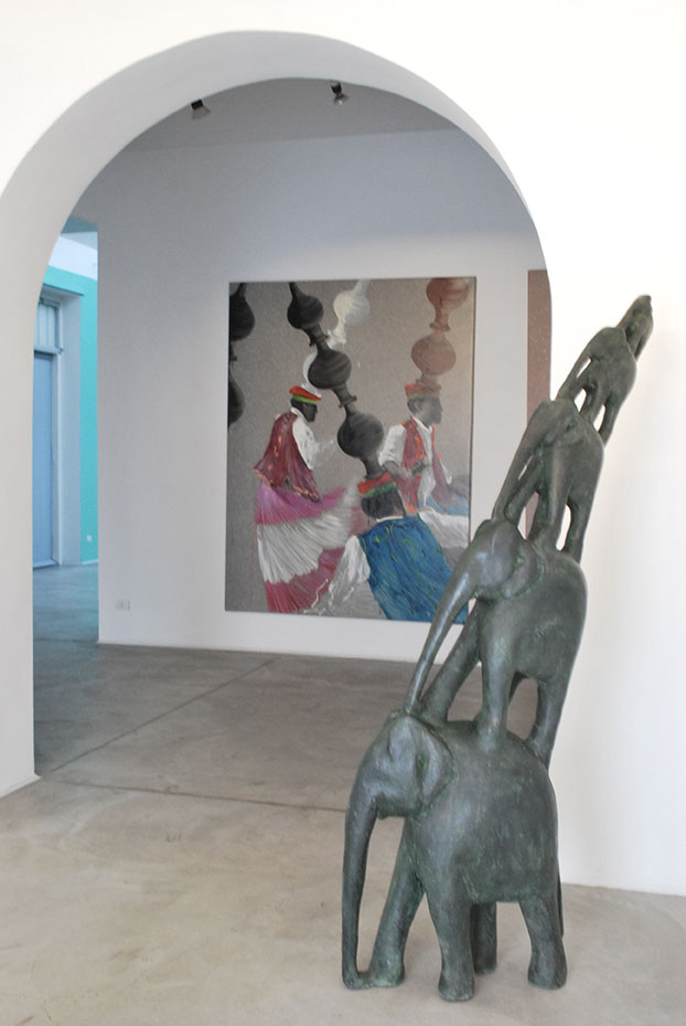 I due spazi espositivi –collocati l’uno di fronte all’altro nel cuore del quartiere milanese Isola– si uniscono per trasportare il pubblico in un itinerario che conduce dal Mediterraneo all’India, ed approdare appunto a Milano, dove con questa mostra l’artista torinese viene celebrato.