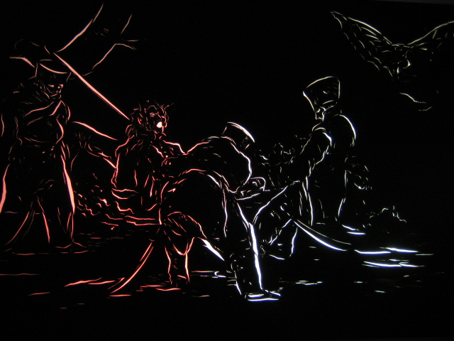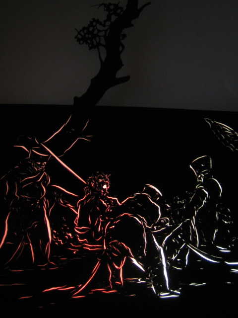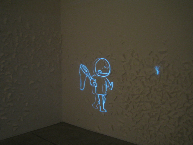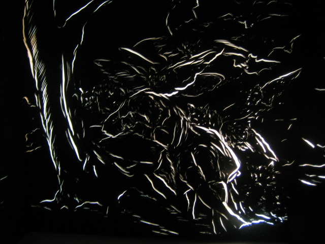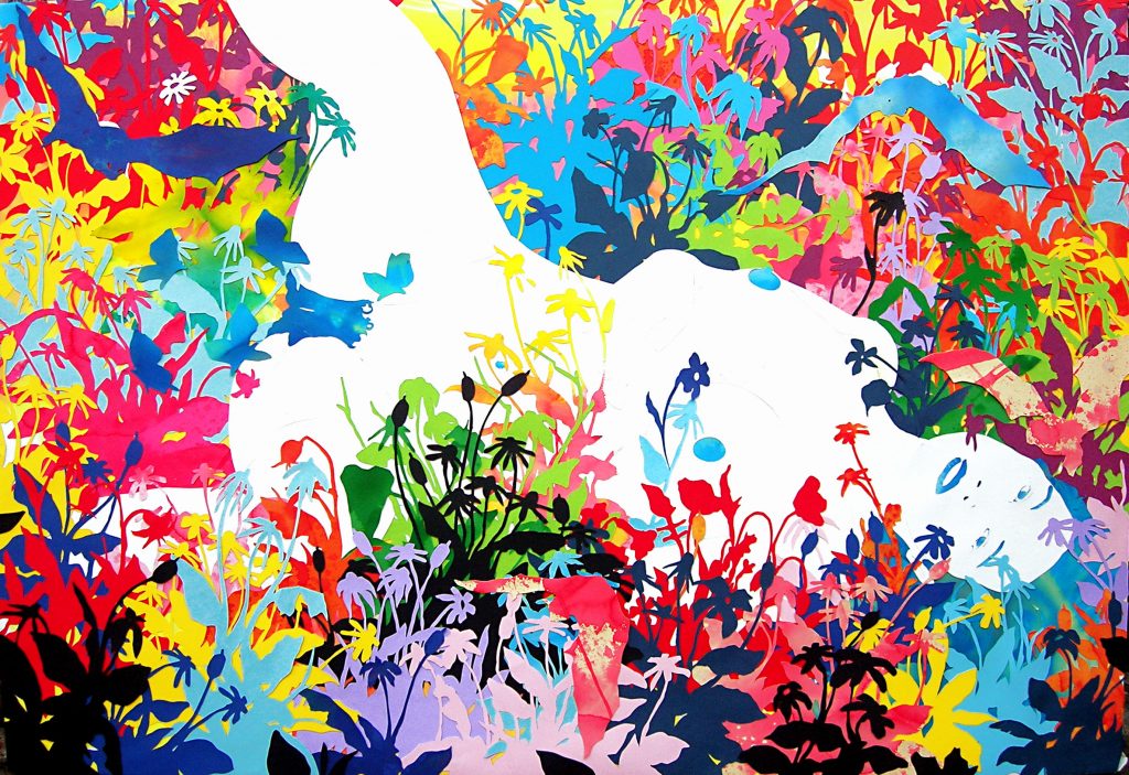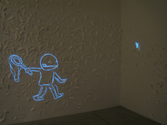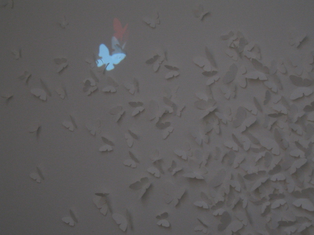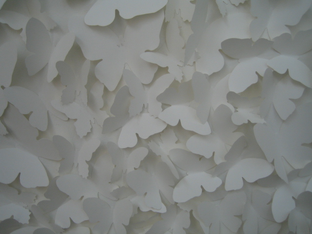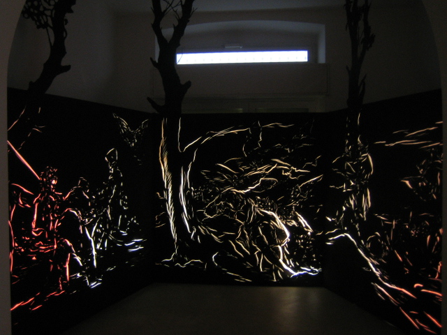 Andrea Mastrovito, giovane artista bergamasco tra i più promettenti sulla scena italiana, “sdoppia” questa mostra personale milanese in due spazi: 1000eventi e Antonio Colombo Arte Contemporanea . Intesa come un gioco di rimandi tra gli opposti, tra luce e ombra, tra bianconero e colore, tra vita e morte, riprende il titolo dalla famosa installazione di Damien Hirst In & Out of Love, straordinaria metafora sul ciclo dell’esistenza esemplificata dall’insetto, dalle uova alla larva, dalla farfalla alla sua decomposizione. Il percorso espositivo di IN & OUT of Life inizia dalla galleria di via Solferino con la parte più fisica e tangibile, giocata innanzitutto sul rapporto tra luce e ombra. Il piano superiore si presenta semioscurato con un’installazione di carta ritagliata. La fonte di luce posta di fronte al lavoro crea un gioco d’ombre sul muro, a citare esplicitamente Guernica. Proprio dalla bocca del cavallo, che ha la stessa postura del capolavoro di Picasso, prende vita una farfalla video-proiettata che, idealmente, esce dallo spazio, vola in strada, fino a raggiungere 1000eventi, unendo così simbolicamente le due gallerie. A terra, invece, una distesa di farfalle nere, deposte come un tappeto, fanno pensare alla morte, all’angelo caduto. Al piano inferiore della galleria Colombo sono esposti quadri-collage i cui temi e colori sono poi ripresi nelle tende arabescate, anch’esse in carta ritagliata. Situazioni e personaggi creati da Mastrovito, il gusto barocco per il particolare, la vegetazione lussureggiante in stile gotico come sfondo ideale per le sue narrazioni, escono, letteralmente, dalle opere bidimensionali, per arrampicarsi sui muri, scivolare sui pavimenti, invadere ogni spazio disponibile. Altrettanto suggestiva è l’atmosfera che si respira da 1000eventi, ma più eterea, improntata sui toni chiari, sulla luce e sul bianco. Nella sala principale di via Porro Lambertenghi tornano ancora le farfalle, simbolo della leggerezza e della delicatezza, che danno origine alle più forme e paesaggi. Un video completa l’installazione, realizzata in collaborazione con Marco Marcassoli, dove la storia della farfalla, che nasce, vive e muore nello stesso giorno così come vuole il suo destino, ha ben sette finali differenti corrispondenti ad altrettanti modi di morire, catturata ora da un camaleonte, ora dal retino di un bambino. Sempre a proposito di leggerezza e fragilità , 30 brevissimi video, quasi degli Haiku, da pochi secondi a un minuto e mezzo, piccole intuizioni germinali, frammenti di altre opere possibili. Finale ideale per questo viaggio nell’effimero e nella fragilità , l’allestimento di tele nere, intagliate e retro-illuminate, concepito come una scenografia tridimensionale nell’immaginario di Andrea Mastrovito.