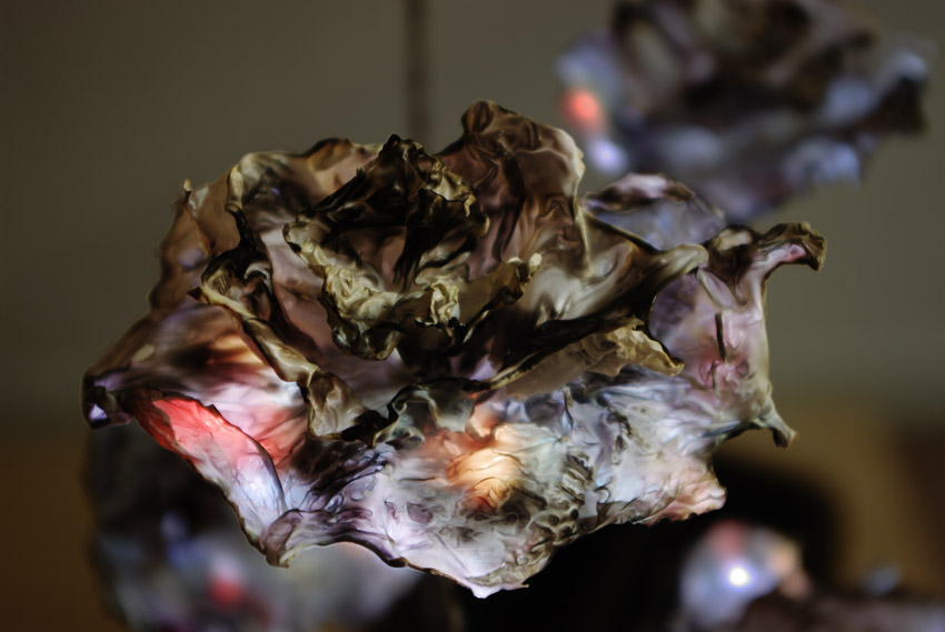 Nell’installazione Sans Titre – Fleurs (2008) un mazzo di fiori dai colori cangianti, immagine poetica ed esteticamente accattivante, nasconde la verità: non un vaso ma una tanica di benzina, non fiori freschi ma pezzi di plastica combusta, sulla cui superficie sono proiettate esplosioni di pozzi petroliferi.
