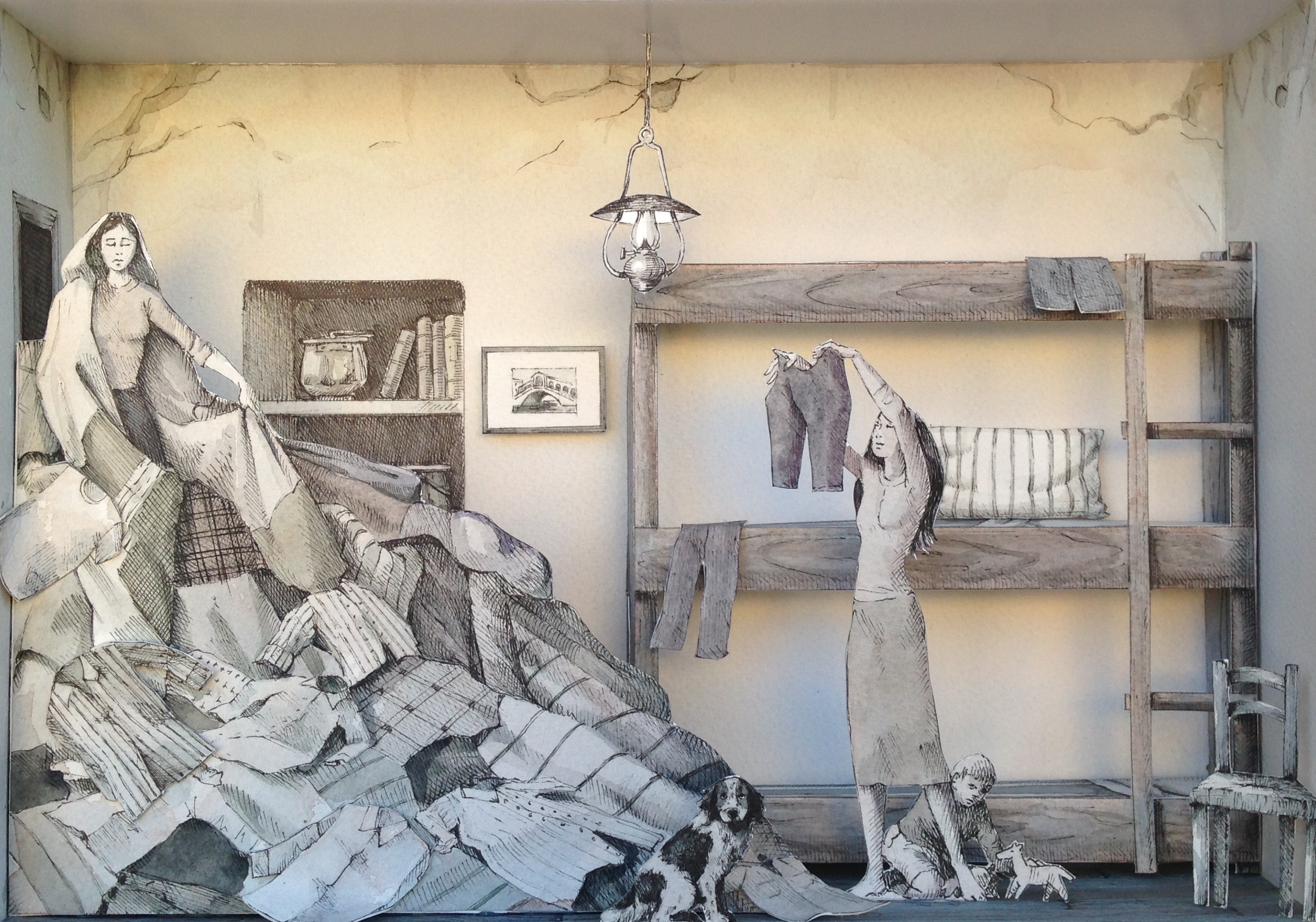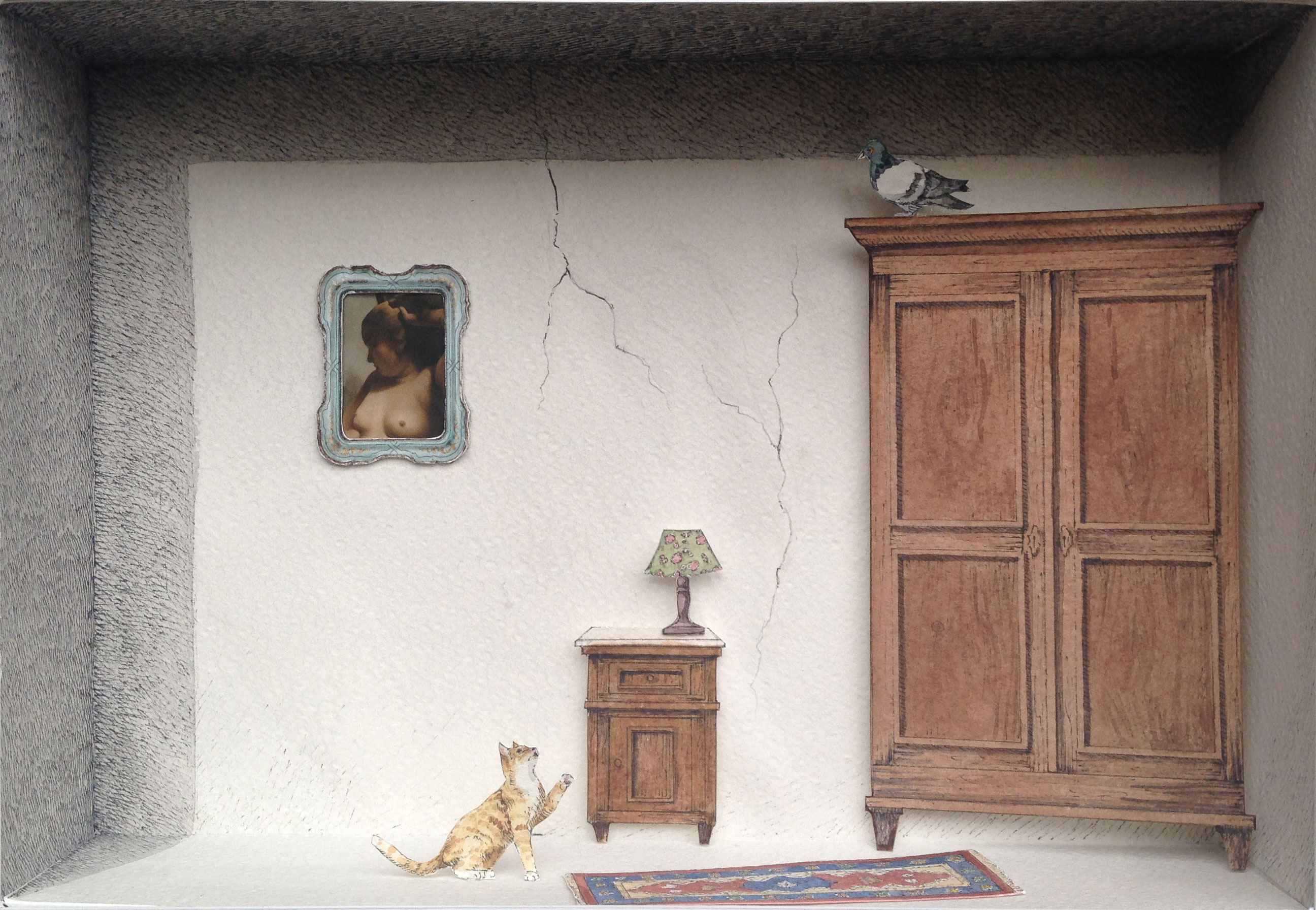 Per quest occasione Vanni Cuoghi prende spunto dalla magia della città di Venezia e in particolare celebra i 500 anni del Ghetto Ebraico.“La magia della città è nota e le storie che si dipanano tra le pietre e le calli si intersecano e si fondono in un articolato gioco di scatole cinesi. A Venezia bisogna sapersi perdere, consigliava Ugo Pratt, e lasciare solidificare le leggende. Quella del Ghetto è la storia di un’isola nell’isola. Su questo fazzoletto di terra, già contaminato nel 1500 da scorie della lavorazione dei metalli, si insediò la comunità Ebraica a cui la Serenissima concesse l’isola. Visitando il Ghetto Ebraico(la parola “ghetto” ebbe origine proprio qui nel 1516) ci si accorge di come gli spazi siano colmi di storie, leggende, superstizioni e immaginazioni tanto da impregnarne ogni singola parete. Questa densità sentimentale mi ha portato a immaginare una specie di sineddoche, le storie degli abitanti del Ghetto rappresentano la storia di tutti gli Ebrei di tutte le epoche, forse perché l’essere “isola nell’isola” dà luogo inevitabilmente a delle amplificazioni narrative. Ho voluto costruire delle scatole, delle case di bambola, ho dipinto e disegnato storie non direttamente connesse tra loro, che spaziano dai giorni della peste ai rastrellamenti nazisti; dal sacrificio di Isacco al Golem; da Corto Maltese alla Venere degli stracci. Ogni monolocale è diventato una stanza con la luce accesa e noi osservatori, guardiamo l’evolversi delle vicende, come L.B. Jeffries in Rear Window (La finestra sul cortile).Quando Giuseppe Pero mi ha proposto di esporre da lui questo progetto, ho avuto l’impressione che ci fosse un’ assonanza a me già nota: la galleria si trova nel quartiere Isola di Milano, chiamato così perché isolato dal resto della città, dallo snodo ferroviario. La somiglianza mi ha fatto sorridere perché la galleria diventerà isola…nell’Isola.” Vanni Cuoghi